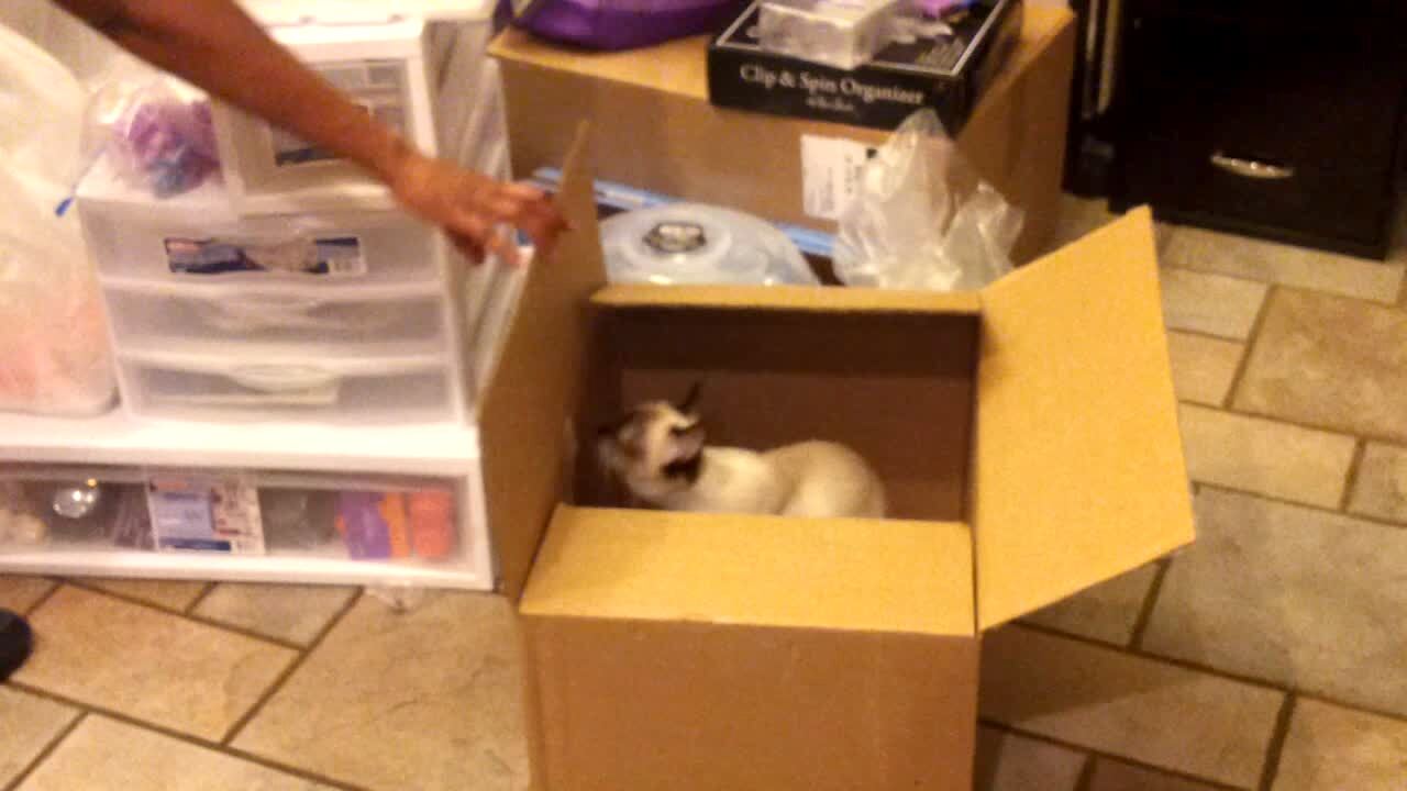 A Siamese cat inside of a box springs up out of in in fright when a dog walks past at home.