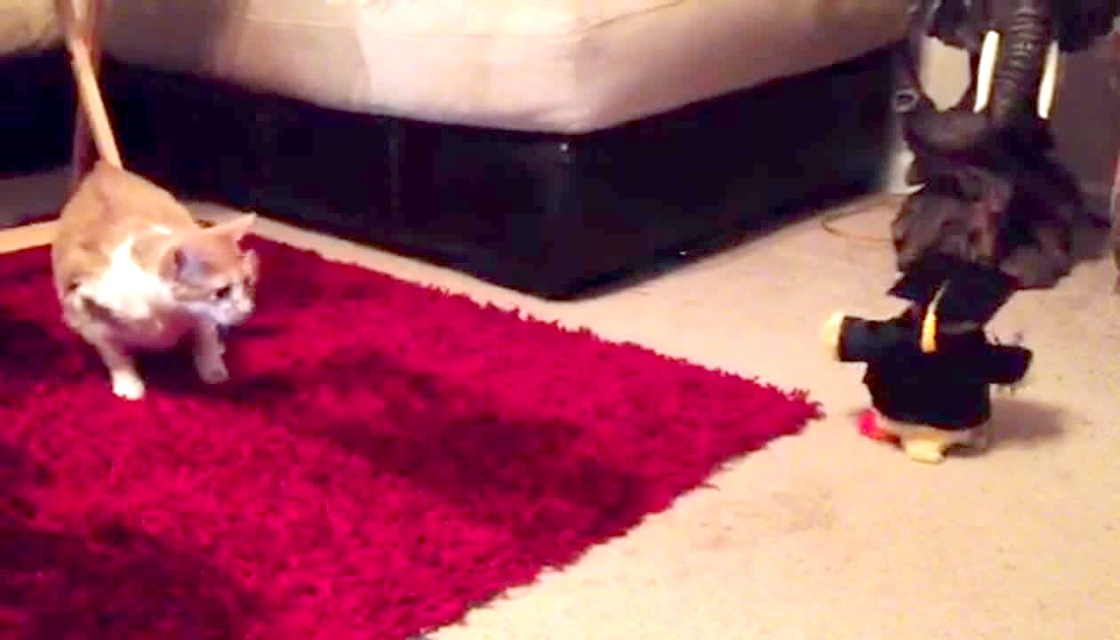 Cat attacks Halloween toy. He attacks it in a very weird manner. Funny movement