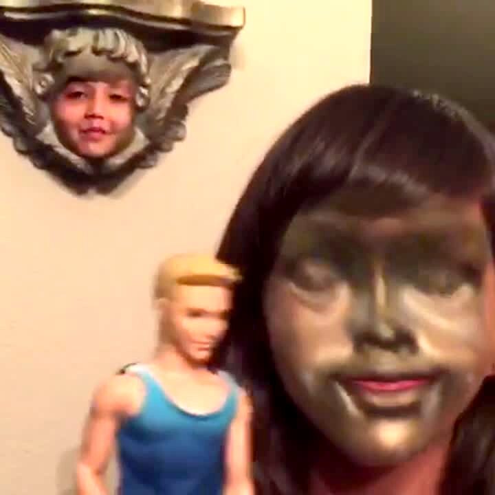 A young girl does a face swap with a baby doll in the living room and says that she's a doll and she's come to life to haunt people. Snapchat.