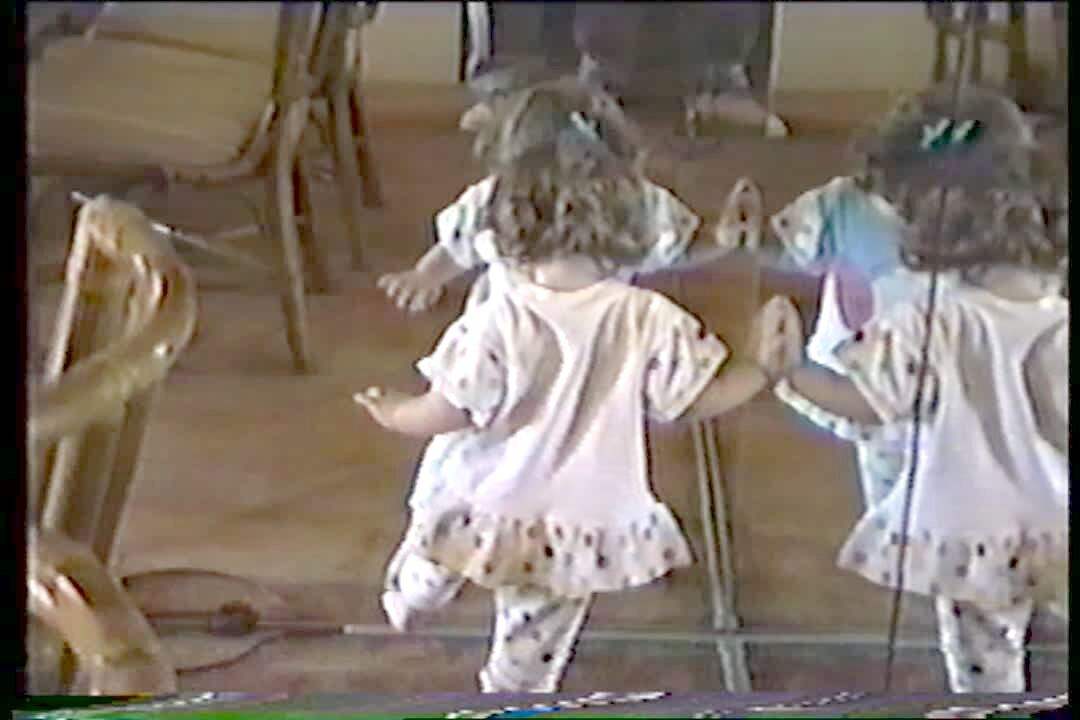 A tot girl raises her eyebrows at her reflection in a camera when she thinks it's another girl.
