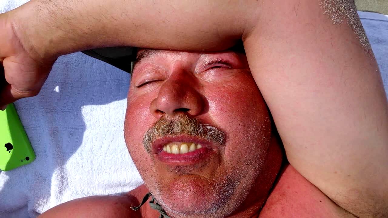 A man's dentures almost come out of his mouth while he snores, sleeping on a beach.