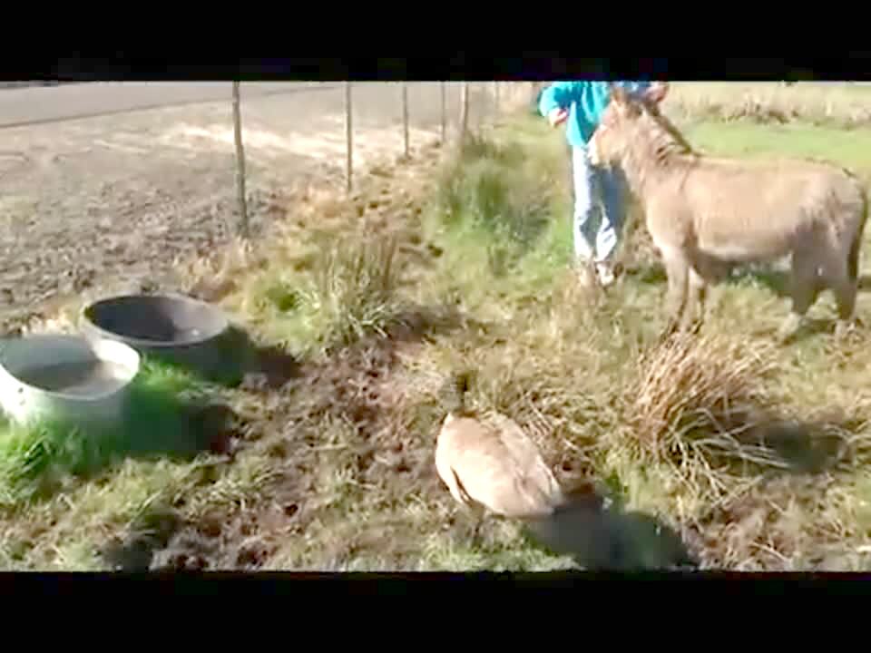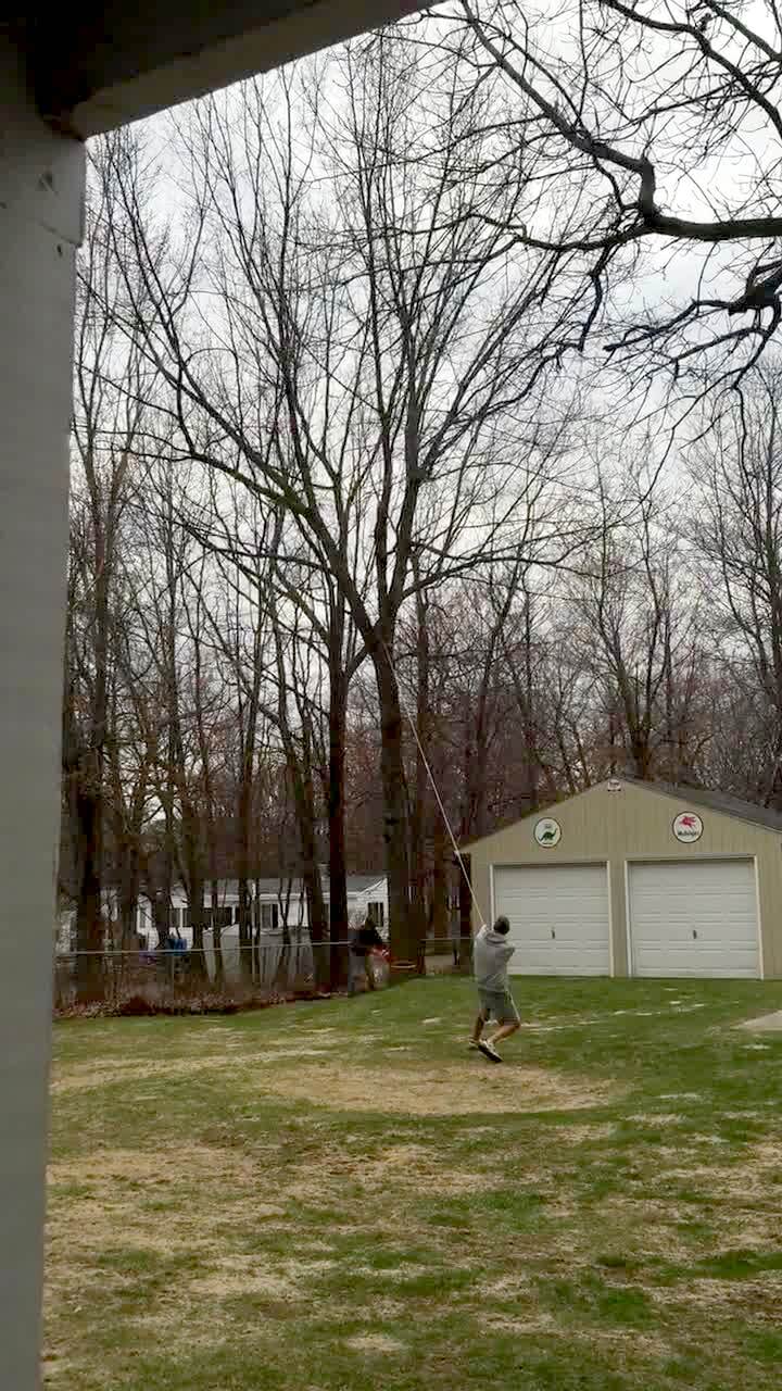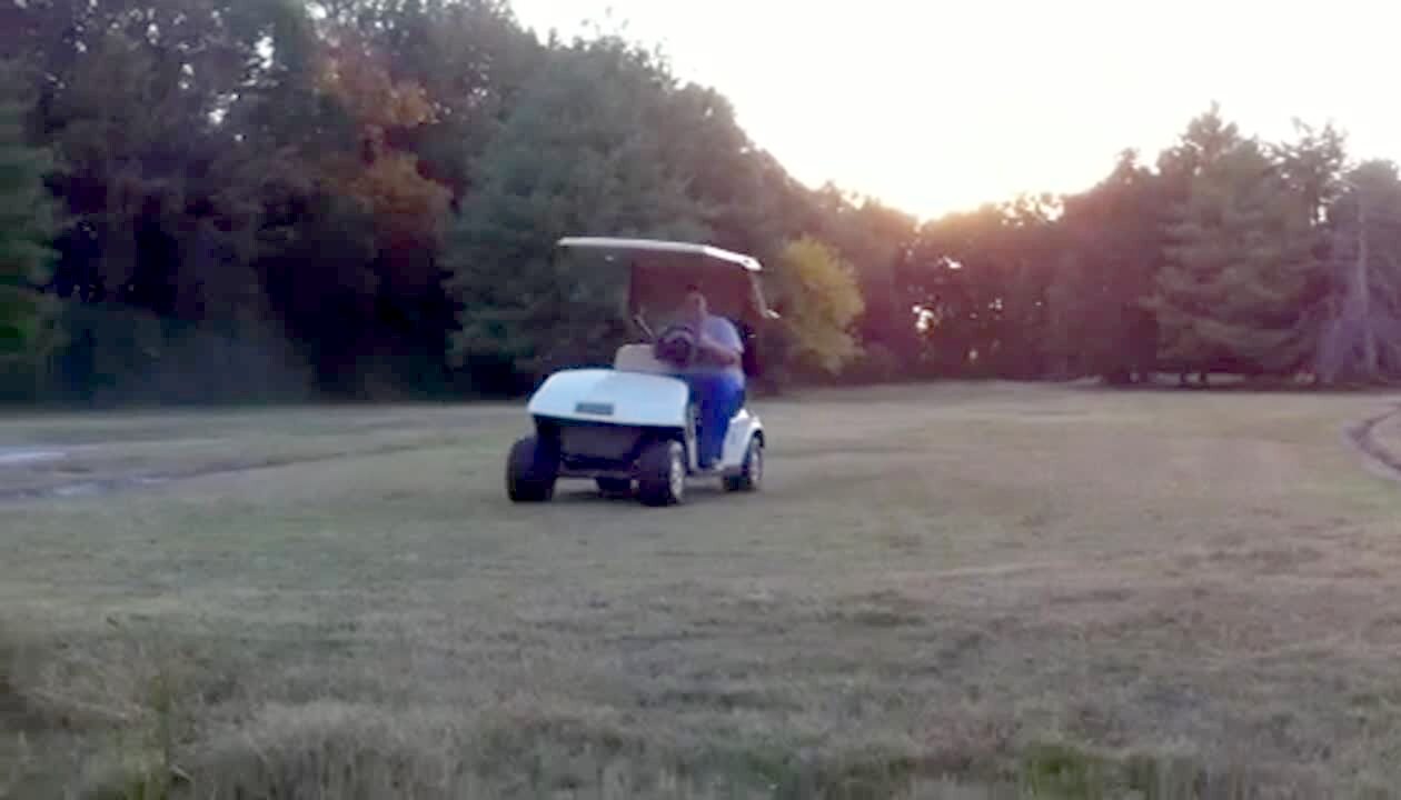 A woman hits her head on a partially open garage door when she runs into the garage.