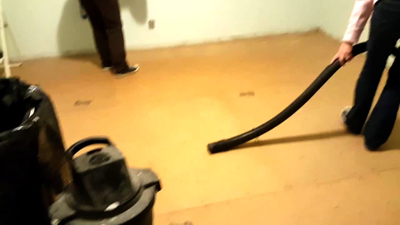 A woman uses a hose to vacuum a room, but the hose isn't attached to the vacuum. A man asks the woman how she is doing and she gives the camera a thumbs up.