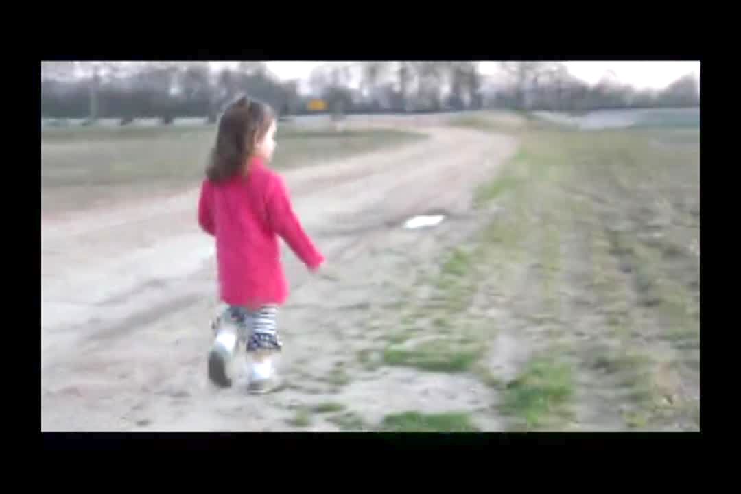 A girl runs back and forth through a doorway that's normally guarded by a child proof gate and a dog follows her back and forth and jumps over the doorway as though it's still there.