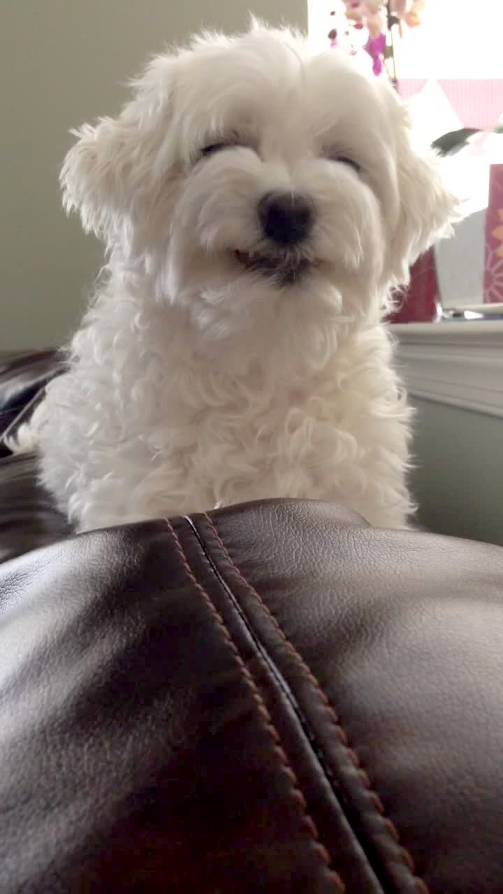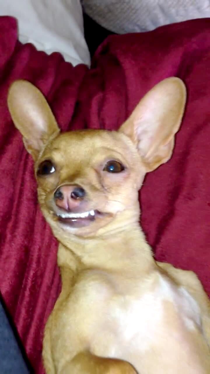 A chihuahua dog learns how to smile for the camera as a girl behind the camera makes whimpering noises with the dog.