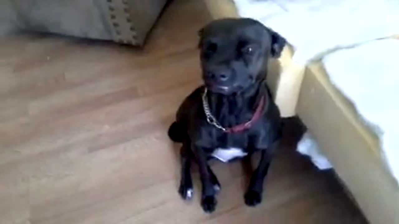 A pitbull dog lies on a bed, a woman asks if it wants to take a bath, it hides under a blanket, then rolls off the bed and falls.