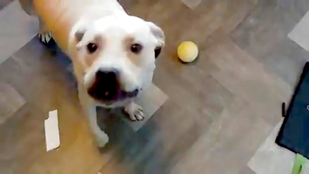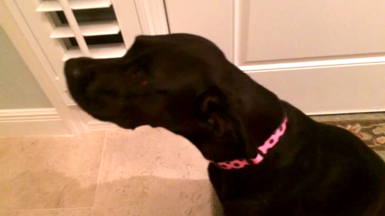 A dog avoids eye contact with a man indoors each time he holds objects in front of her and asks if she ate them or pulled them off the wall.