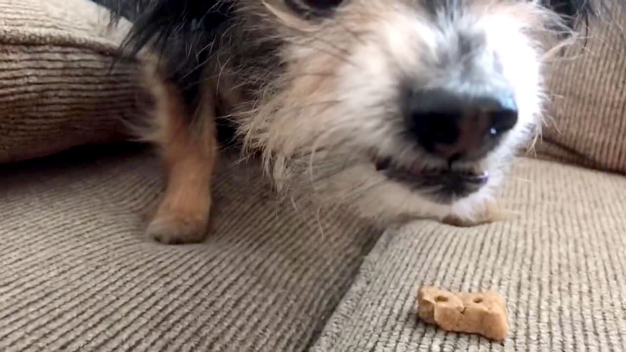 A chihuahua dog shows its teeth on its back indoors while a woman asks to see its smiles.