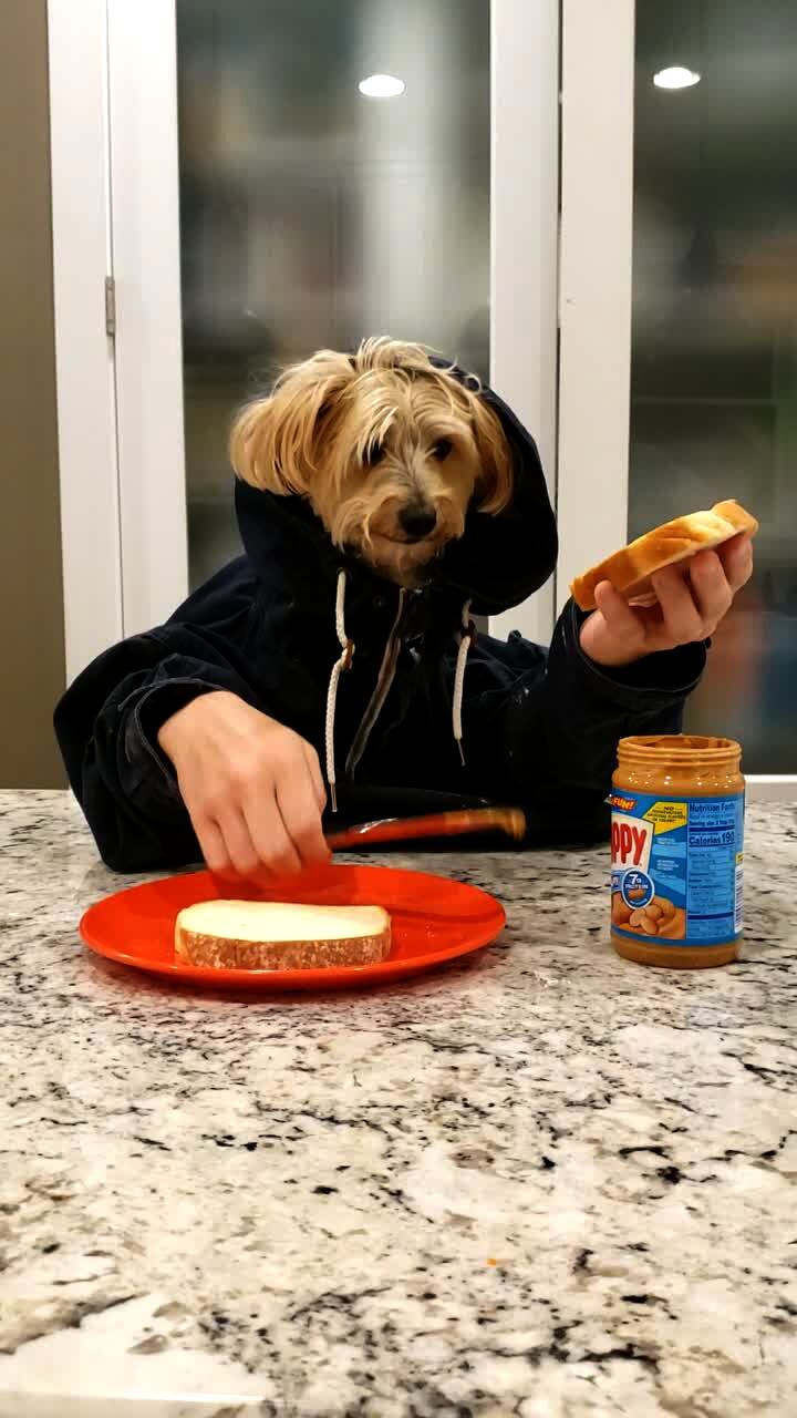A dog makes a peanut butter sandwich at a kitchen counter and eats it.