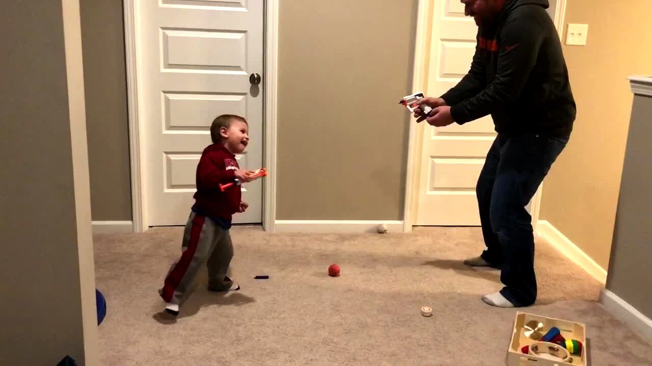A man and a tot boy have a nerf gun war. The boy pretends to be hurt, then he shots his Dad. The man is hit in the groin and falls to the ground.