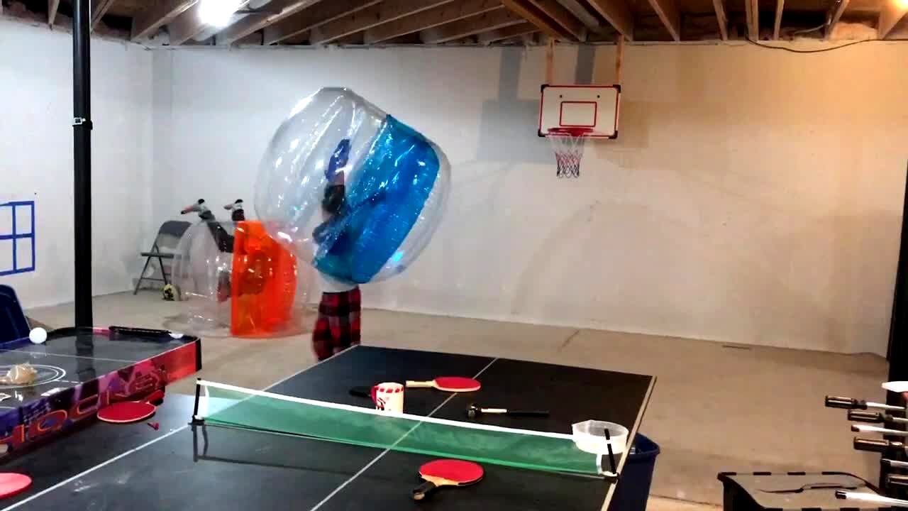 Two young boys wear inflatable ball knockout outfits and run into each other. One of them lands upside down with his legs sticking up in the air.