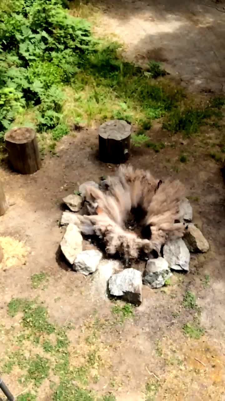 A boy throws a water balloon off a porch in slow motion. It explodes in a fire pit and shoots soot and ash up in the air. AA: water balloons in super slo-mo.