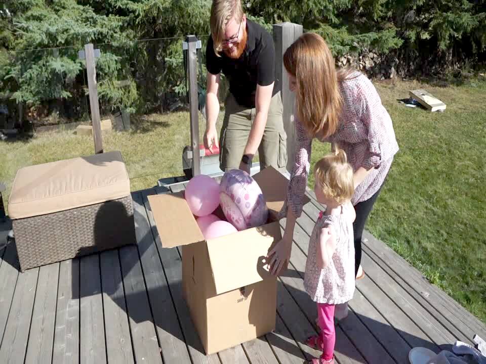 Young girl pops balloons by sitting on them, One sticks to her hair and she doesn't know where it went. She spins around looking for it.