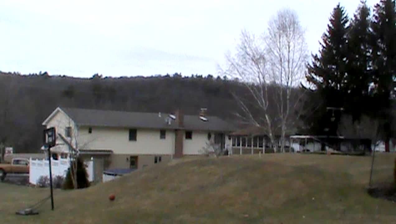 A teen boy throws a basketball up onto a hill at another teen boy standing on a large trampoline and holding a small trampoline. The teen boy hits the ball with the small trampoline. It bounces back across the yard and lands in a basketball hoop. Awesome trick shot.