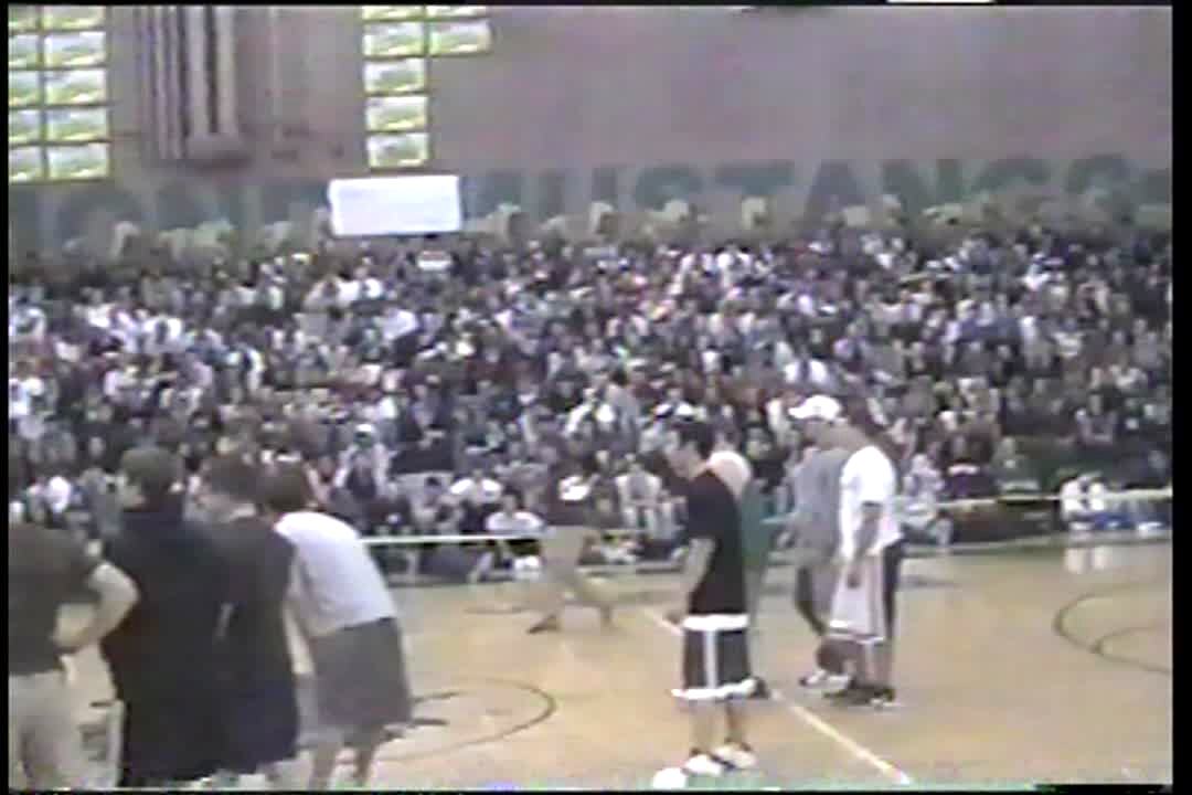 Teen boy tries to jump off his friend's back to slam dunk a basketball over his teacher. He slips & falls into man hard. Knocks him off chair onto the court. With recovery. High school gym.
