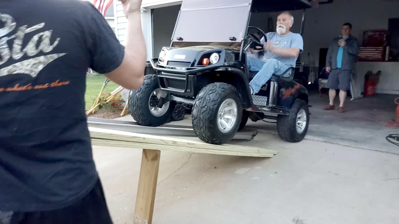A senior man tries to drive a golf cart up a wooden ramp and onto a truck. The ramp breaks and the golf cart falls off and flips over.