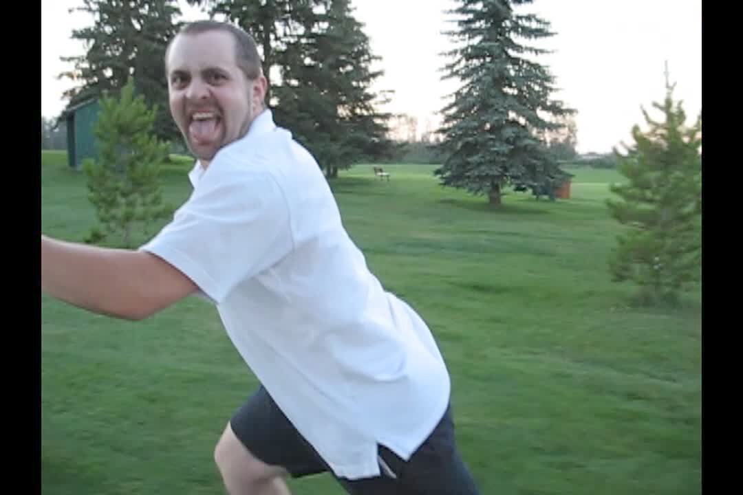 A man tries on the golf course tries to imitate a golf swing from the movie 'Happy Gilmore' and falls down into the green.