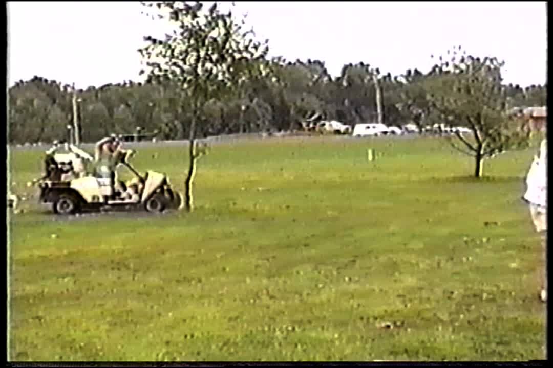 Teen boy drives golf cart over mound on golf course, crashes and falls out of cart. Bonehead.