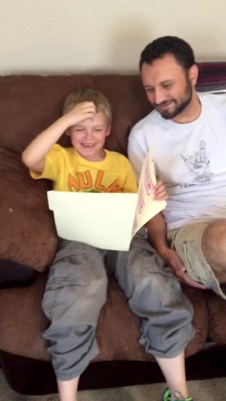 A woman surprises her husband and son with a pregnancy announcement indoors.