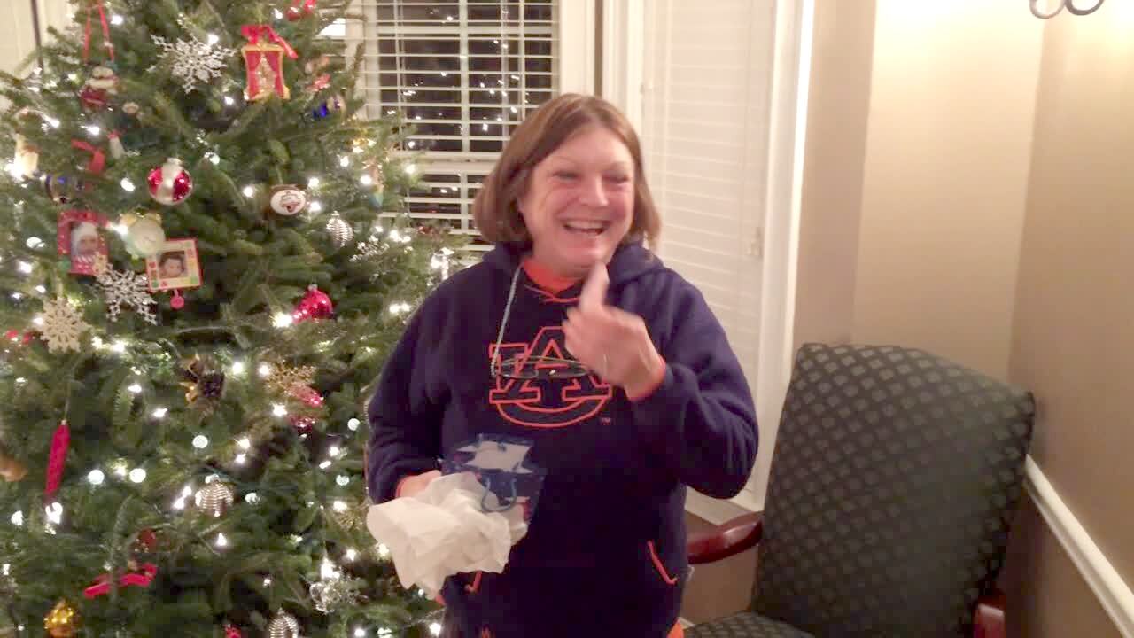A woman opens a Christmas present and finds a pregnancy test that she thinks is lip-gloss and smiles. Then she takes a harder look and realizes her daughter is pregnant. She cheers excitedly and hugs her.