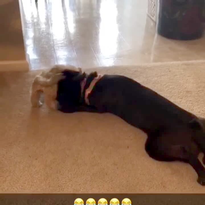 A big dog flips a little dog over with her nose. Snapchat banner: Several happy crying emojis.