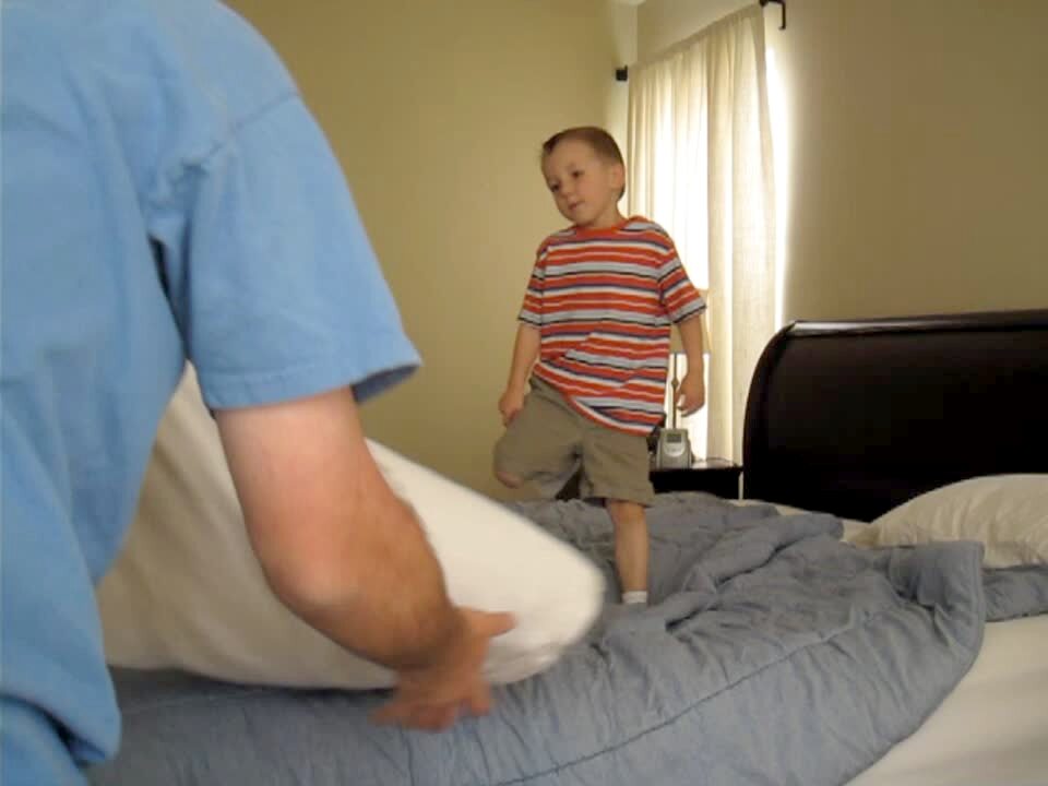 A man and teen boy jump vertically sat home, trying to hit their heads on the ceiling. The teen boy hits his head and puts a hole in the ceiling.
