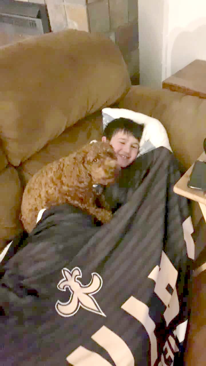 A teen boy holds a young boy while he runs in the yard in slow motion and then trips on a dog and they both fall. Slo-mo