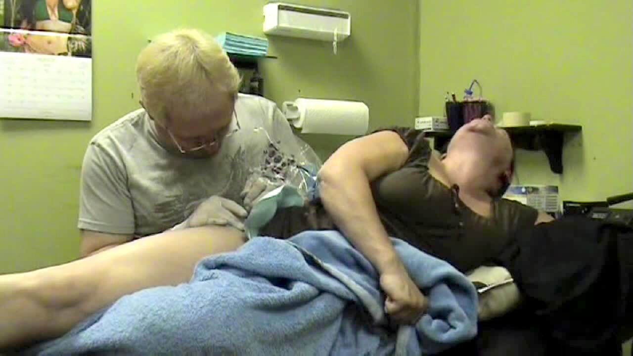 "Tattoo Torment" While woman gets tattoo, she growls and makes funny sounds during the pain.