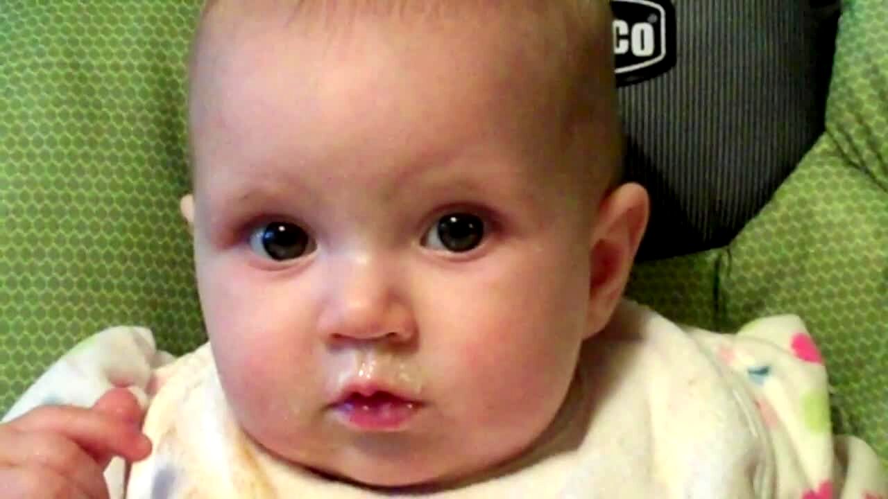 Baby girl eats baby food and makes a funny face. She squishes & gurns her face, puckers her lips. First foods.