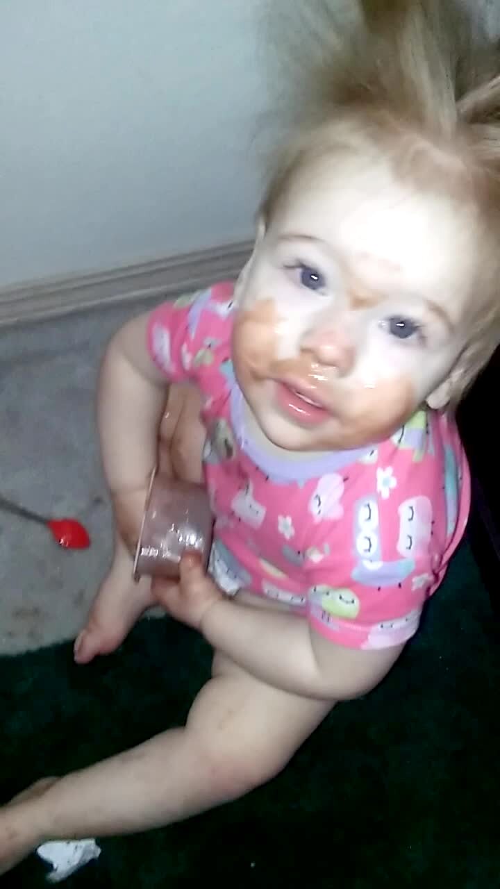 A tot girl sits behind a couch, face covered in chocolate pudding and digging into the container.