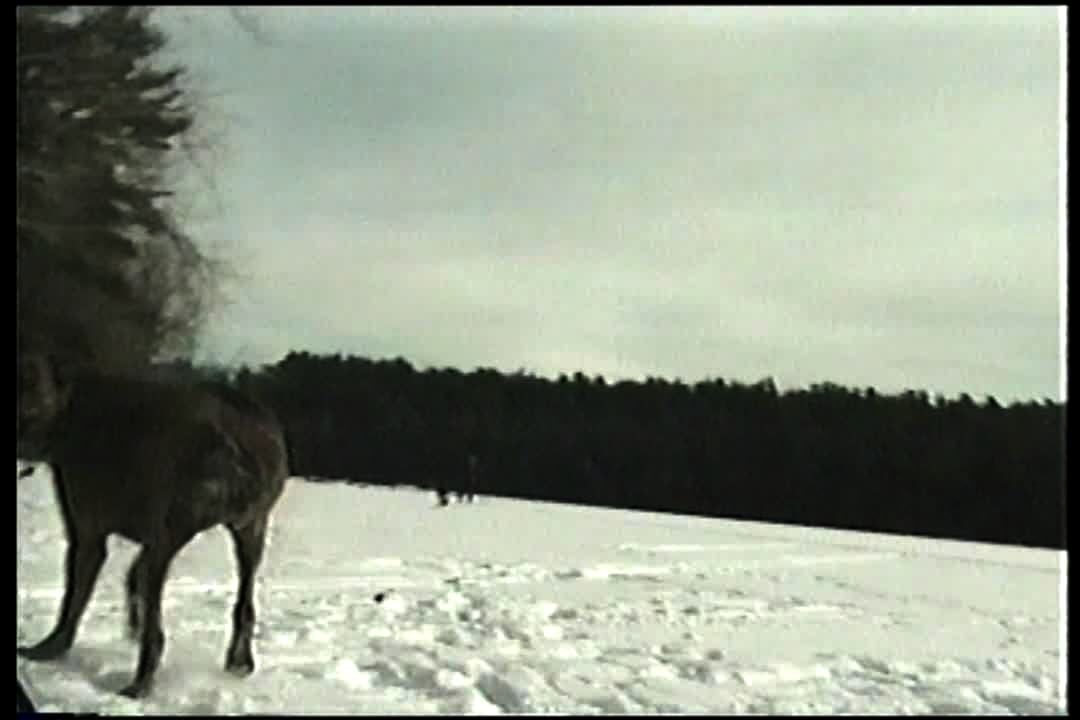 Two Labradors run down a dock to a woman behind the camera, then one dog falls into the lake.