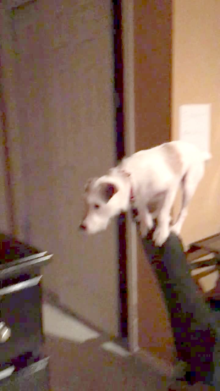 "Dog Pen Plunge" - A woman climbs into a dog's play pen cage in the living room and trips and falls pulling the cage down. The dog runs away in fear of the loud crash.