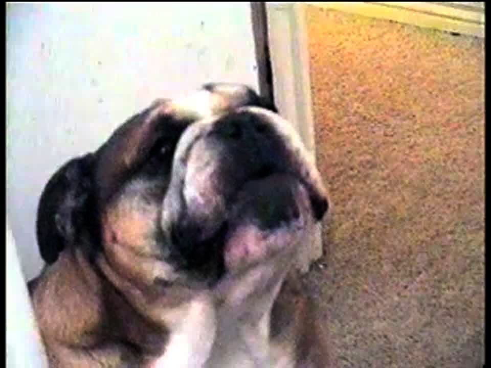 Woman asks bulldog to say "I love you" and he does. Talking pets.