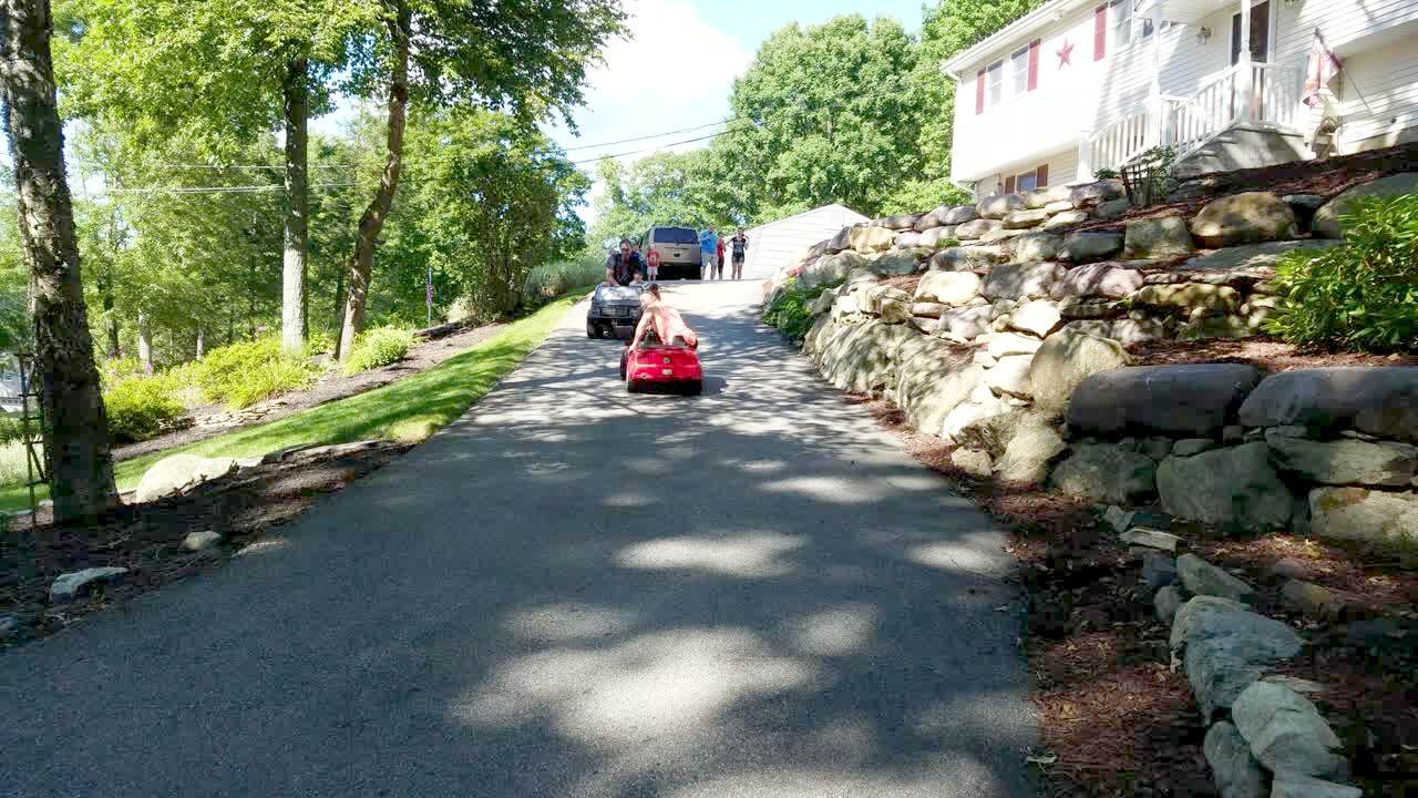 A young girl dances in front of a swimming pool until her sister pushes her into the water.