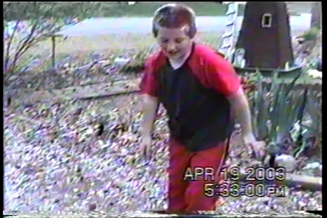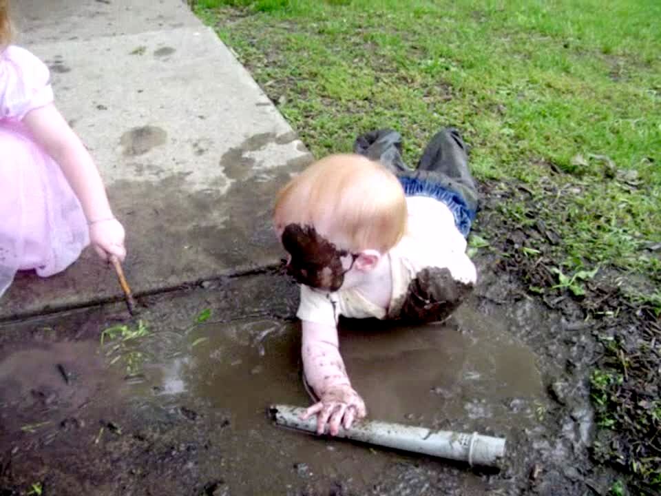 Tot boy is covered in mud. He slides down slide and lands face first in puddle. His face is completely covered in mud and he freaks out.
