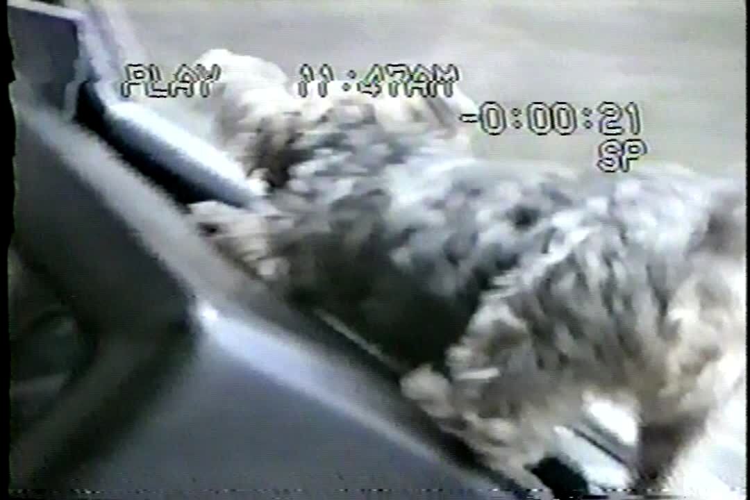 Angry little dog bites and chews on windows as it rolls up and down. Date on screen