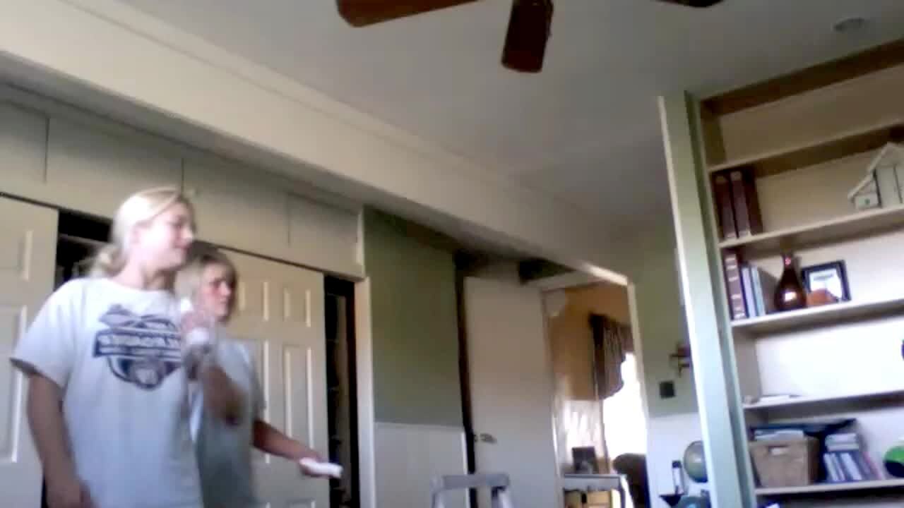 Young girl and her mom play Wii Sports video game mom hits girl's funny bone/ elbow with controller at :24