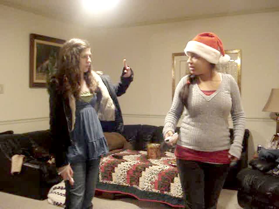 A young girl accidentally hits another girl in the face with a Nintendo Wii controller. Security footage.