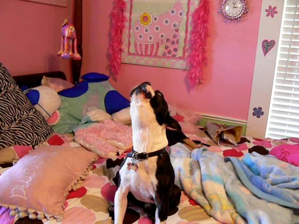 Bulldog turns his head from side to side and howls when girl makes noises. Dog sits on polka dot sheets on bed.