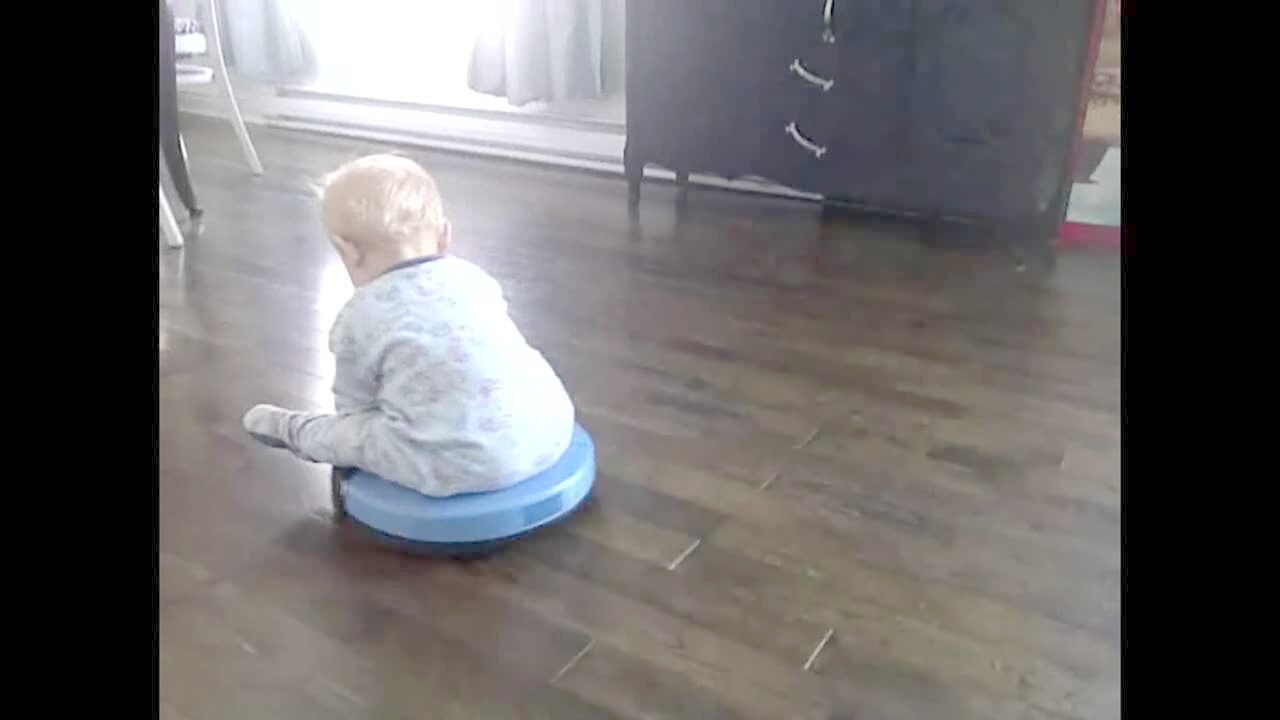 Tot boy rocks/scoots playpen across hardwood living room floor.
