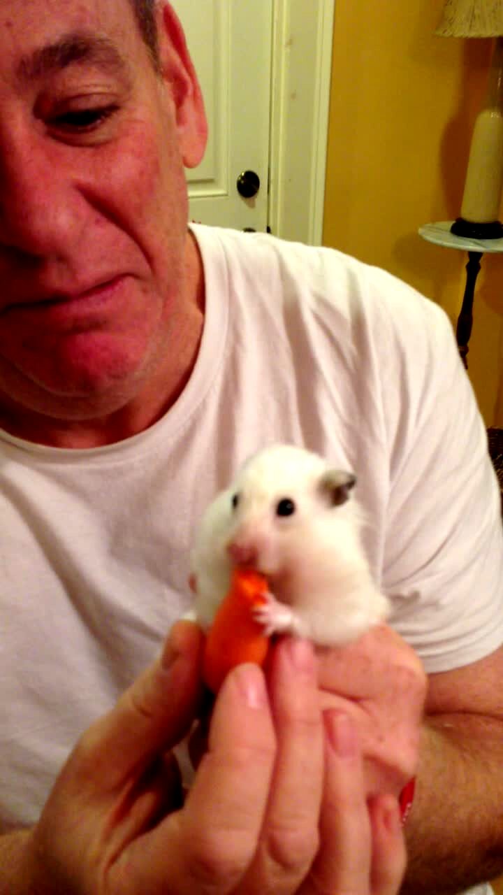 A Hamster frantically licks peanut butter off of a spoon that a man gives it at home and tries to put the entire spoon in its mouth.