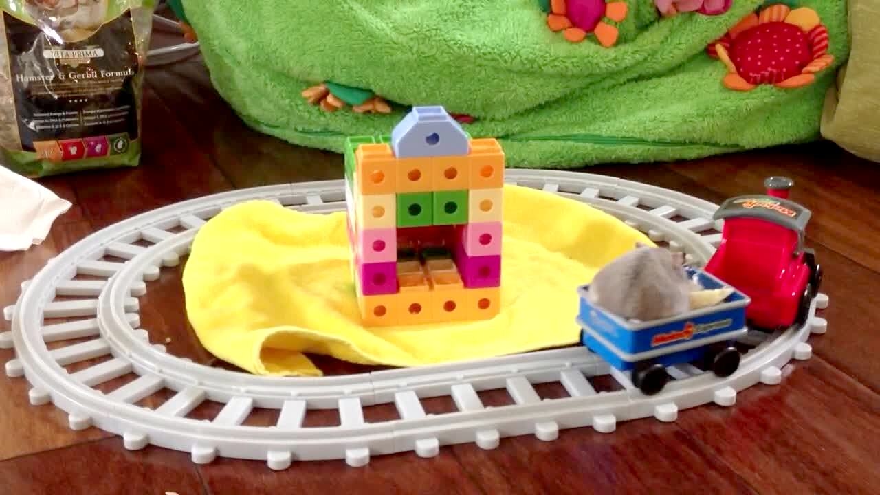 A grey hamster rides around a toy track on a toy train indoors.