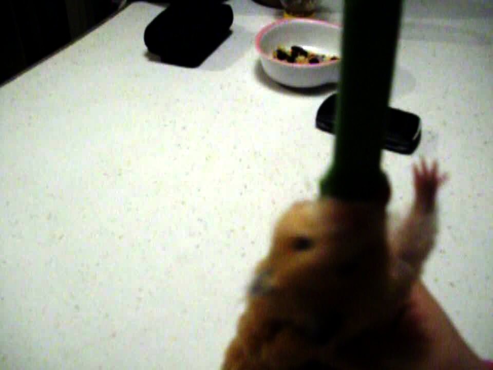 A hamster nibbles at a piece of food as it sits in an adorable hamster high chair. Music rights not cleared.