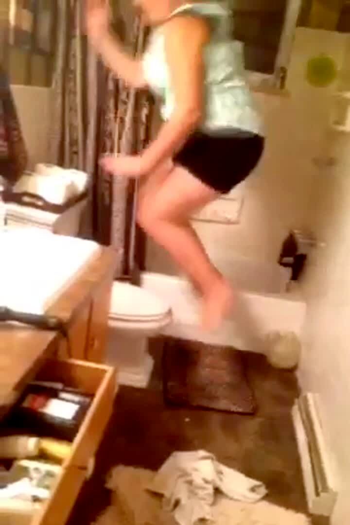 A teen girl films as water erupts out of a bathroom toilet and shoots onto the ceiling as an adult man is spotted at the end under the cabinet attempting to stop it.