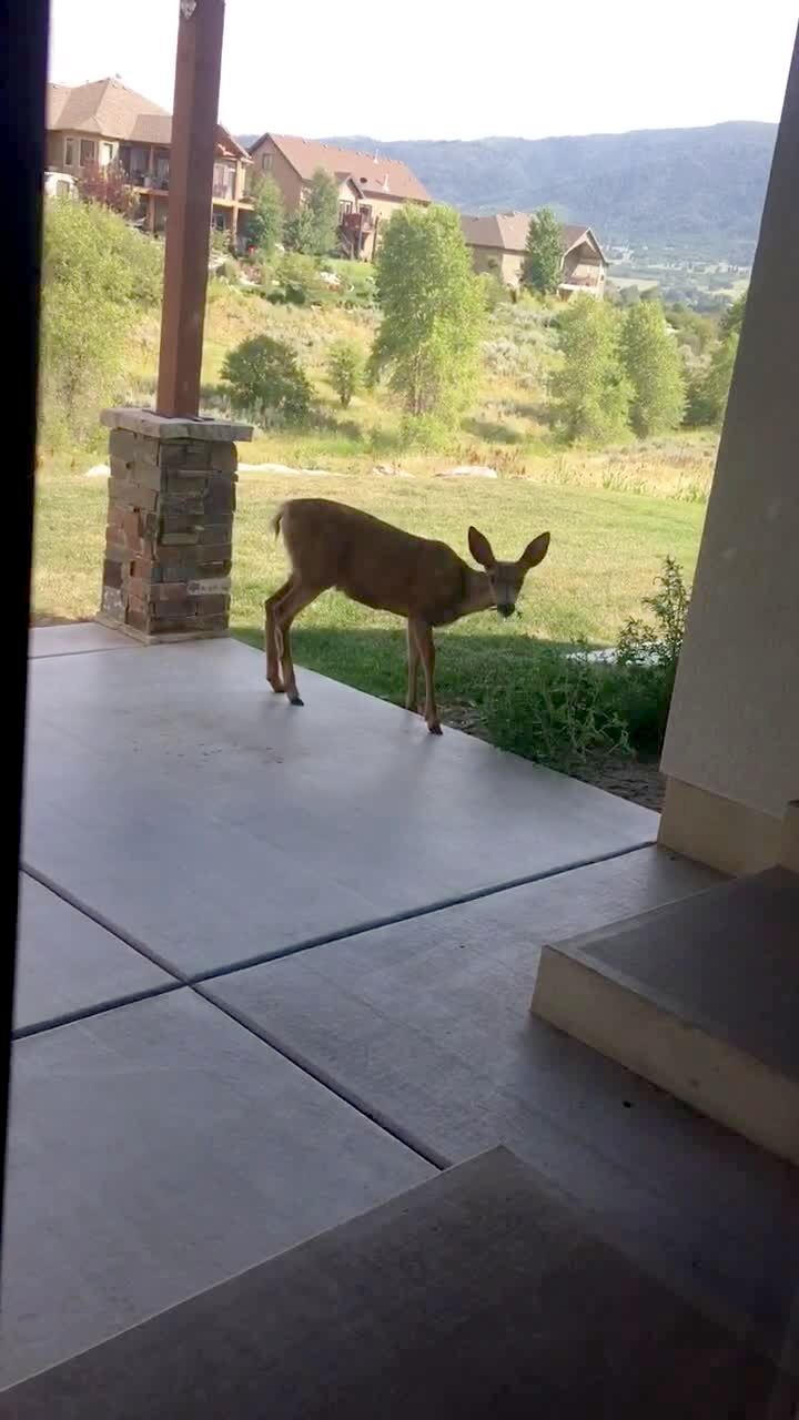 A small deer slips and falls on a porch when it runs away.
