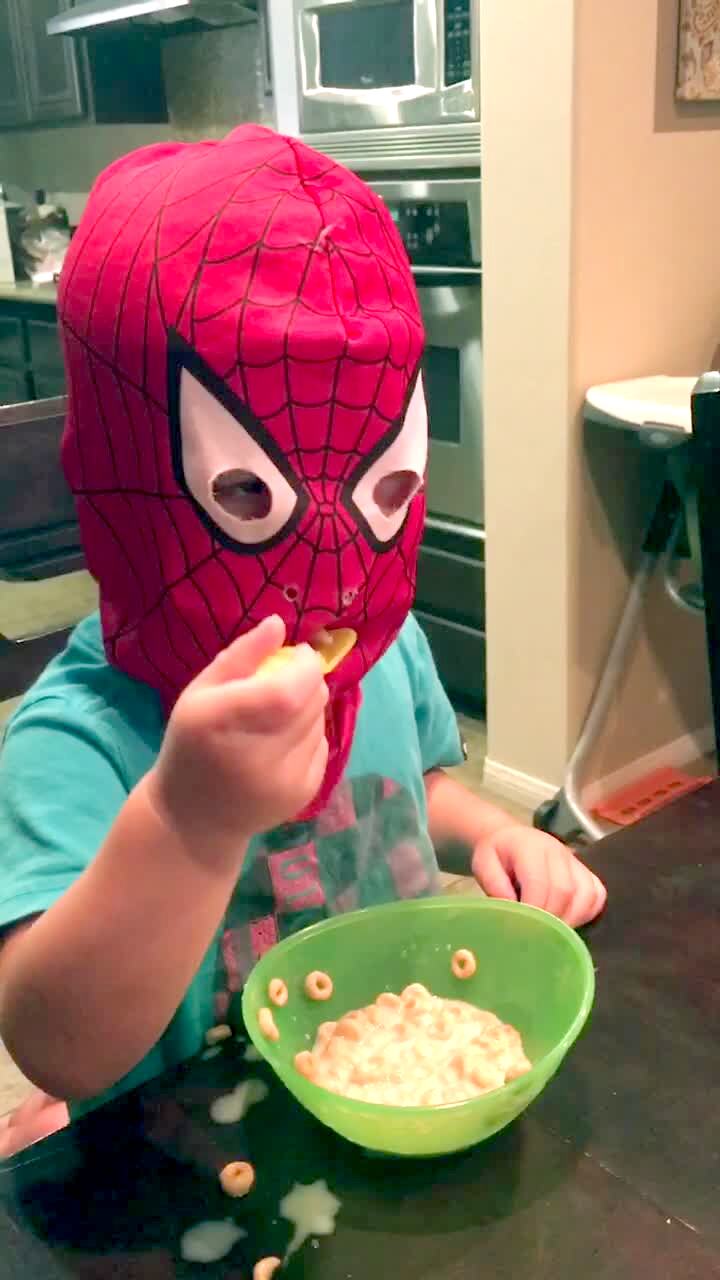 A tot boy tries to eat cereal with a spiderman mask on. He finally takes it off.