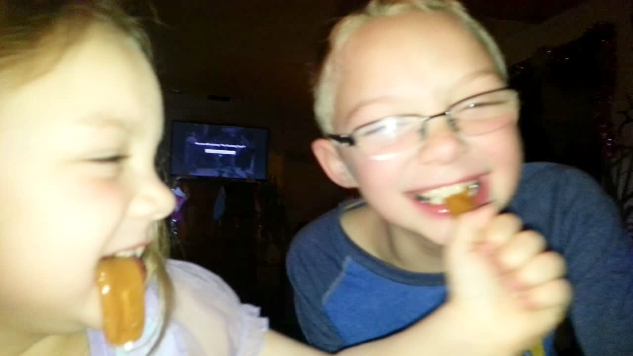A young girl pulls out her brother's tooth when she pulls candy out of his mouth.
