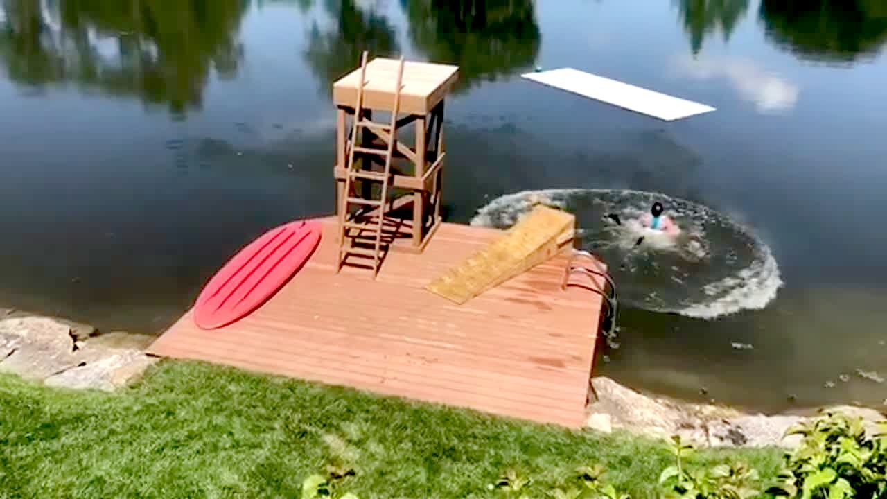 A young boy holds a dog up to the pie in the face game and tries to hit his dog with a pie but it misses the dog and hits him in the face instead