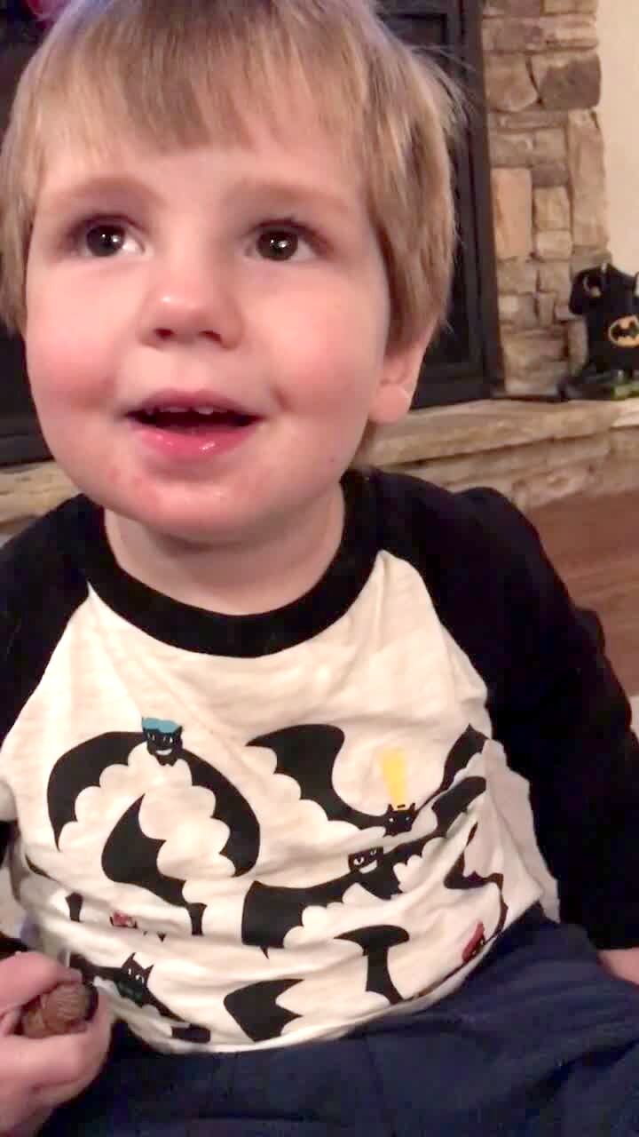 A tot boy in a living room holds a stack of foam letters in his hands. His mom asks "are you ready to mail your letter to Santa?" and he nods his head. She explains to the camera that he thought he meant his alphabet mat letters, not his envelope.