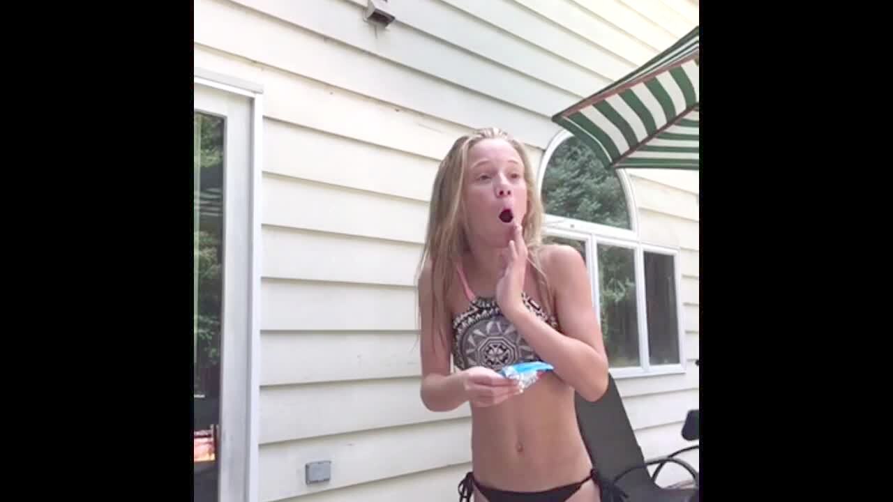 A young girl throws a piece of food into the air and tries to catch it in her mouth. A dog jumps in front of her face and takes catches the food.